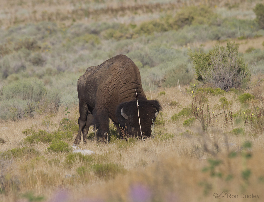 Earlier that same morning while we were photographing humminbgirds an old friend wandered by – a bull Bison with a broken leg. That leg’s been broken for over a year now but this bison is a survivor. He puts no weight on the right-rear leg and limps mightily but he survives and even seems to thrive.
