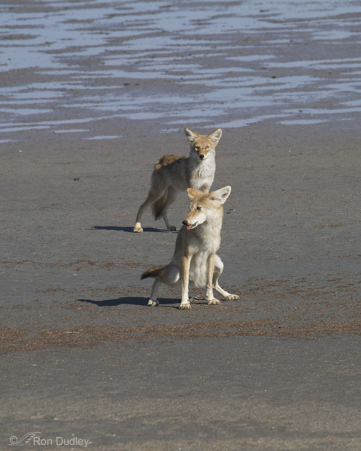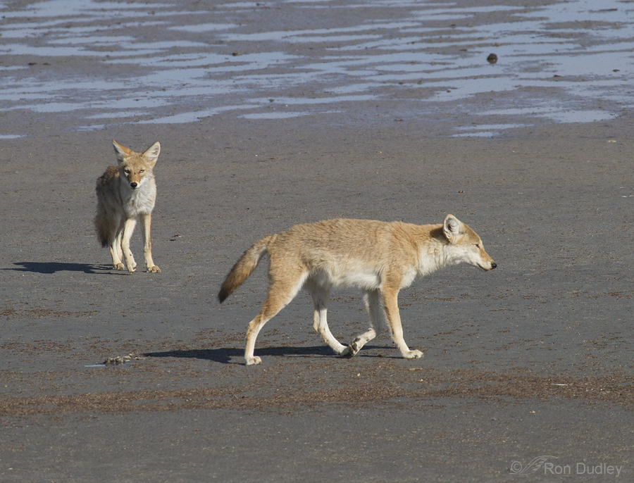 Late last week we encountered two coyotes walking east along the north side of the Antelope Island Causeway. One was a very light-colored adult and the other a slightly darker and smaller youngster. This summer has been a mighty survival struggle for the island’s coyotes – the vole populations crashed and the extreme heat and drought have taken their toll. These two actually seemed forlorn and destitute in both posture and demeanor as they walked the shore of the causeway. But they did show me several interesting behaviors that I was able to photograph.
