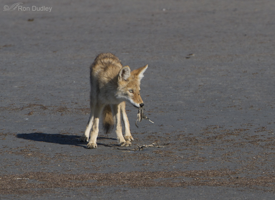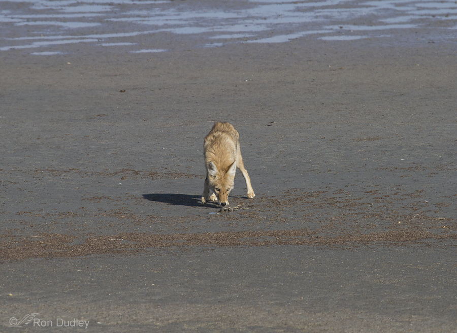 We followed the coyotes east for quite a while and eventually they stumbled upon what I believe was the remains of a shorebird that had been previously fed upon. There wasn’t much left but bones and a few feathers.