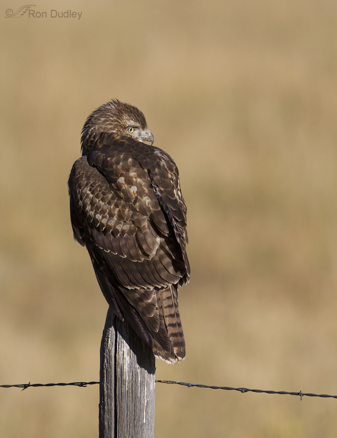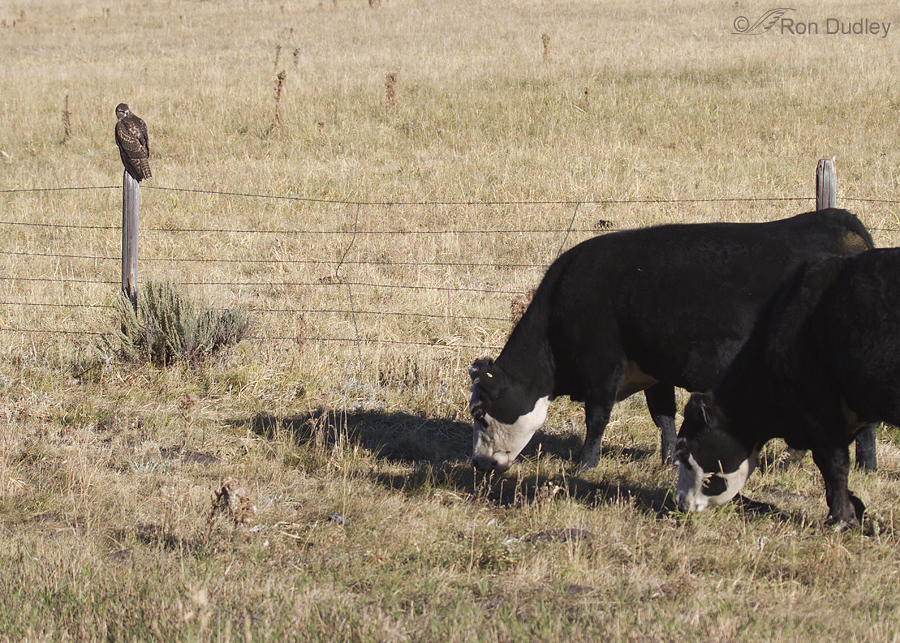 and landed on one of the fence posts. Here the young hawk is watching the cattle as they continue to approach from the right.