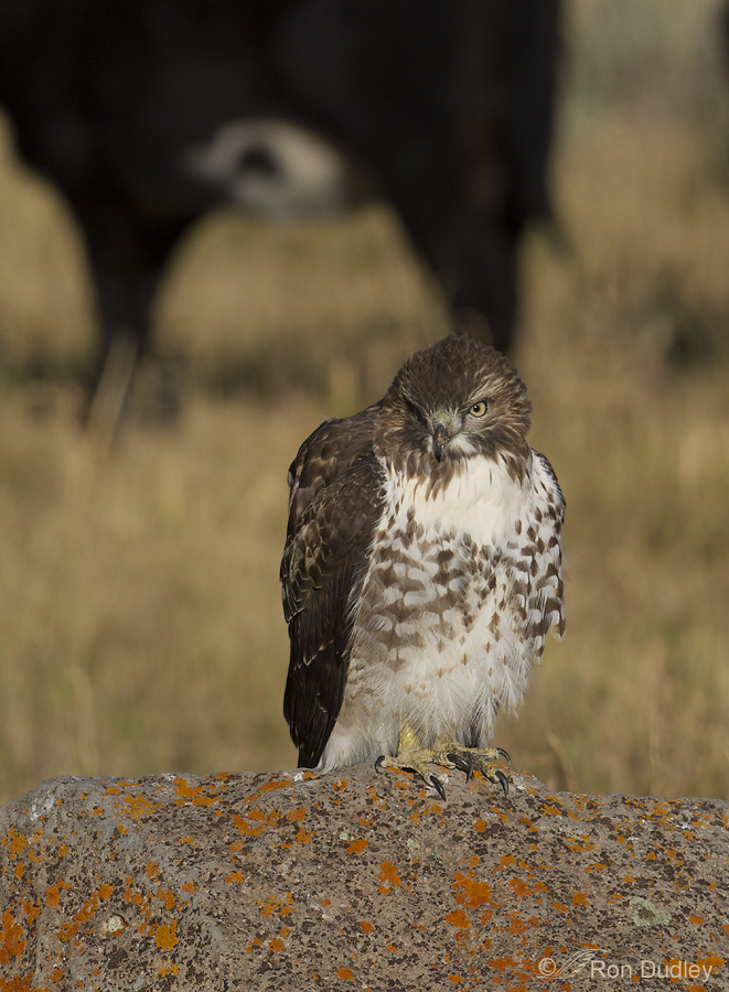 This part of the valley is largely private land and there are lots of cows. The fences are old and rickety so many of the bovines escape and graze the “virgin” grasses between the gravel road and the fences – and that’s where this rock was. Here a cow (and several others) is passing between the rock and the fence, very close to the hawk. The disdainful expression from the bird says it all…