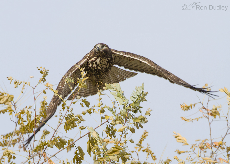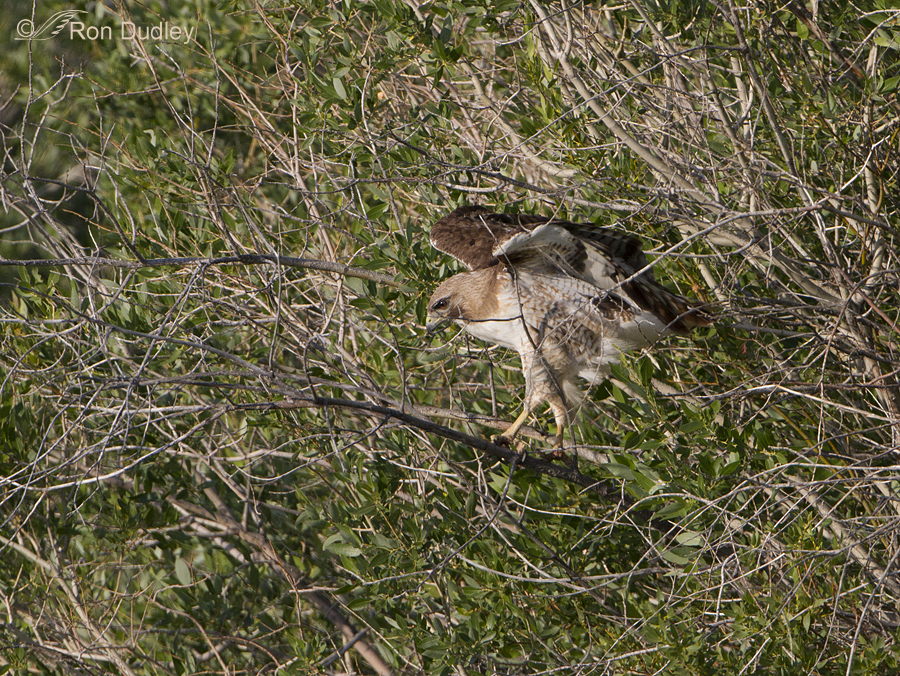 Yesterday morning I found this juvenile Red-tailed Hawk buried deeply enough in this tree (notice that there are branches in front of and behind the bird) that flying out presented an obvious problem. At first I thought the bird would turn around and take off away from me because there were fewer obstructing branches in that direction but this bird took off toward me, possibly because the wind (blowing pretty hard) was coming from behind me.