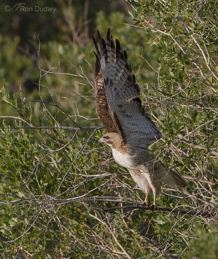 When I first found this Red-tailed Hawk (sequence taken this past summer in Montana) it was buried about as deeply in the brush as you can get. When it was ready to take off it walked as far out as it could on the darker branch that is its perch (as it’s doing here). It then paused for some time as it seemed to consider its take-off strategy in such an obstructed setting.