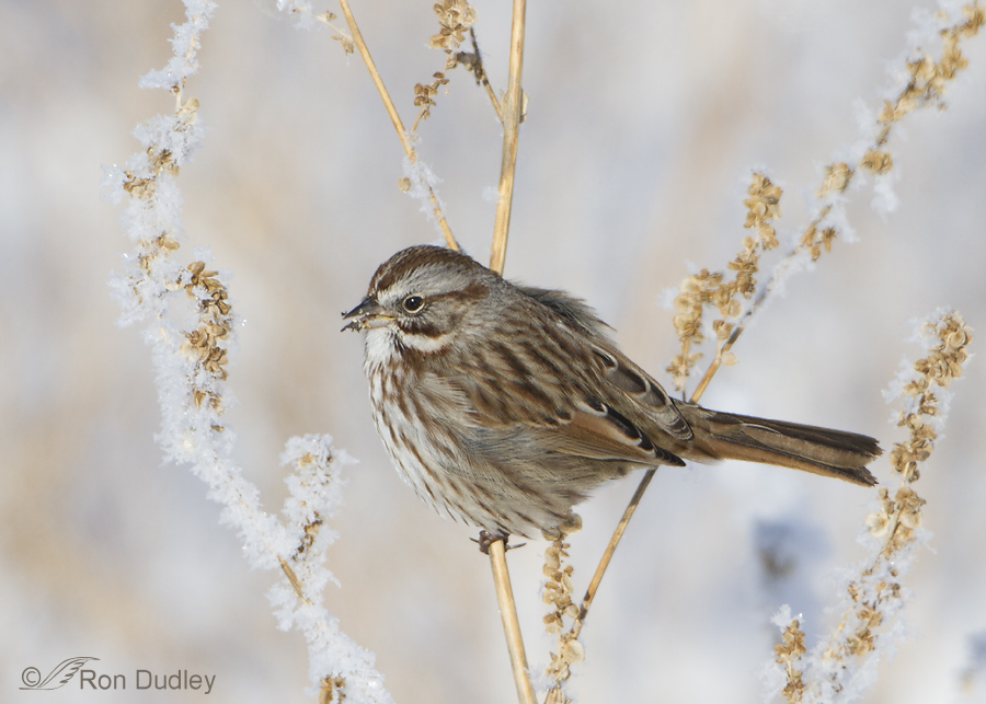 When the sparrows first began to feed, literally every twig was frost-covered (like the twig on the left) but their frenzied activities knocked the frost off of some of the twigs and seed clusters. This Song Sparrow was in the process of plucking the seeds in front of its face.