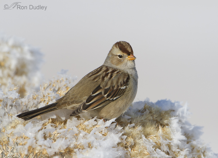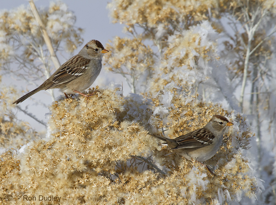 But it was the plucky juvenile White-crowned Sparrows who put on the best show. Rabbitbrush seeds seem to be one of their favorite foods and they were very active as they browsed the frost and snow-covered plants.