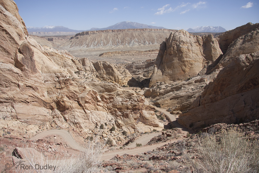The Burr Trail is nothing short of an adventure – these are some of the infamous switchbacks in the Waterpocket Fold. The perspective of my lens at 17mm tamed the steepness of this road dramatically – believe me it takes your breath away as you climb the extremely steep and precipitous gravel road, making hairpin turns as you go. If you look closely you can follow the road from the bottom of the frame to the bottom of the valley near center-top. The Henry Mountains in the far background were the last mountains to be added to the map of the lower 48 states (in 1872). They’re so remote that before 1872 they were called the “Unknown Mountains”. To this day the Navajo people call these mountains Dził Bizhiʼ Ádiní (“mountain whose name is missing”).