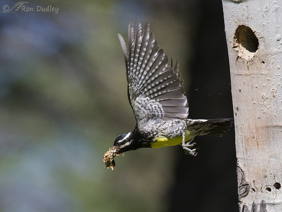 The 5″ x 8″ (interior dimensions) tree nest hole of the Williamson’s Sapsucker with as many as 6 growing nestlings inside presents a significant potential hygiene problem. This post is about how the adults dealt with that situation as I was photographing them about three weeks ago near the Montana/Idaho border.