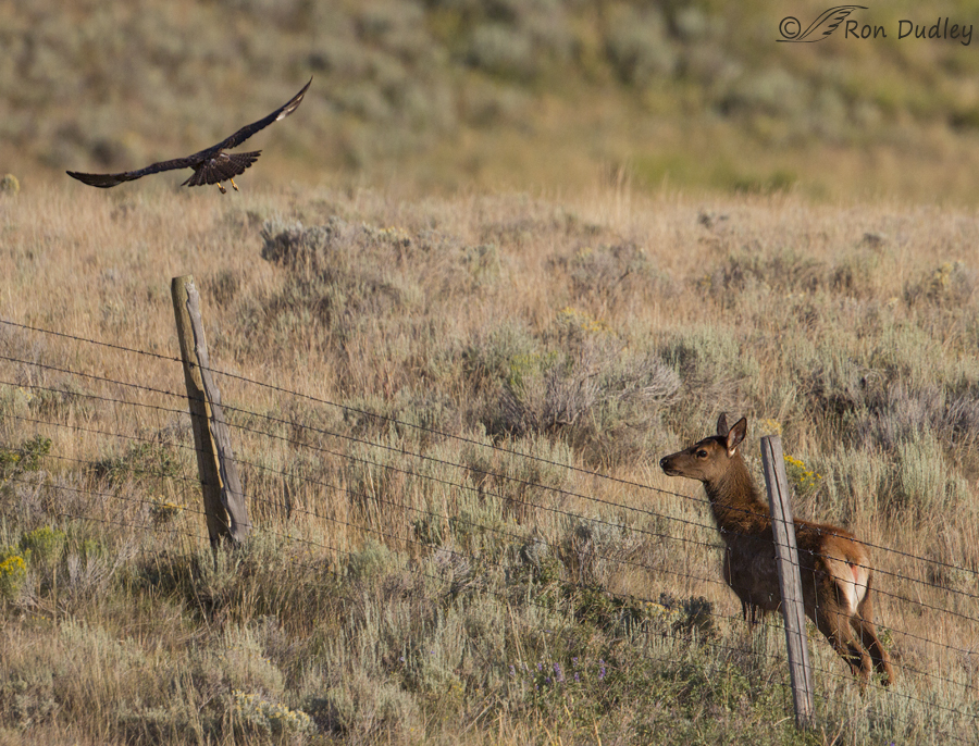 This past Sunday morning as I crested a very large hill (Monida Hill) at the west end of the Centennial Valley I noticed an elk calf below me and behind a fence.