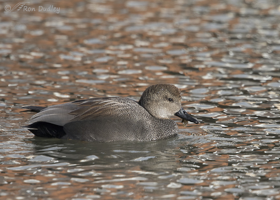 A male Gadwall with plant material in his bill at a local pond. What struck me here is the unusual colors and patterns reflected in the water – they almost remind me of hundreds of small, strange-colored lily pads packed tightly together. I don’t think I’ve seen anything quite like it in water reflections before.