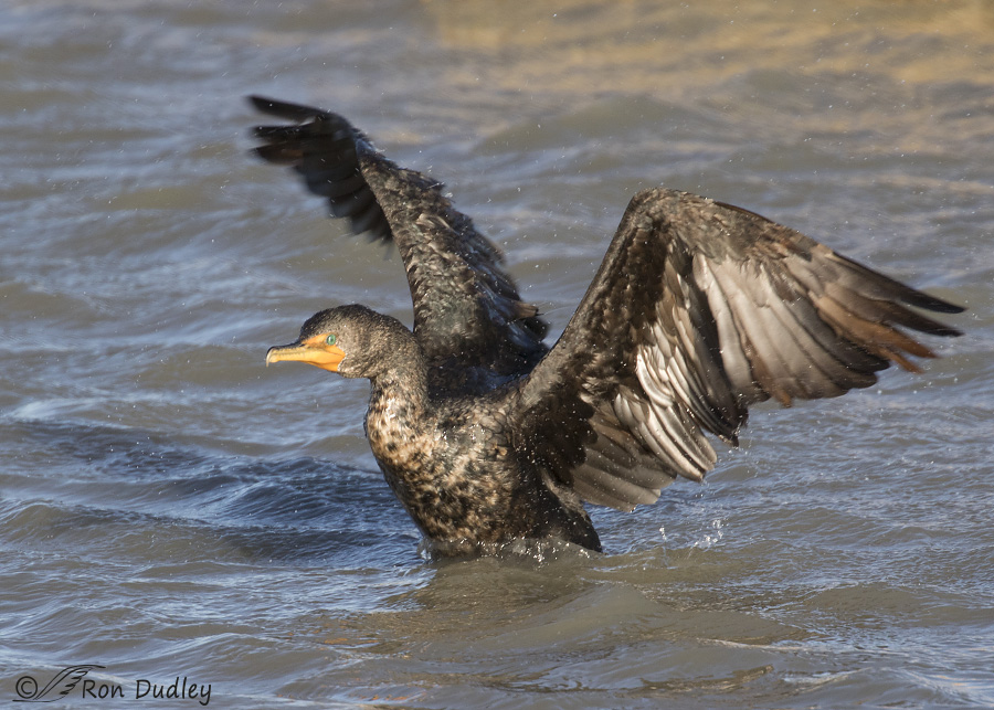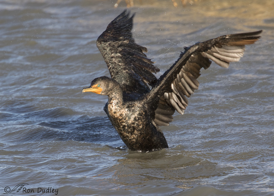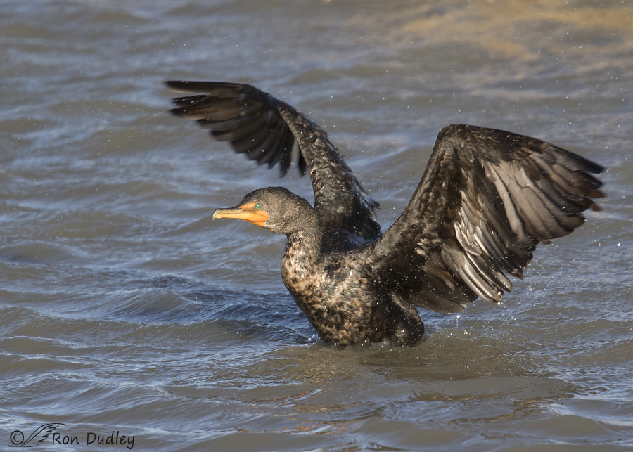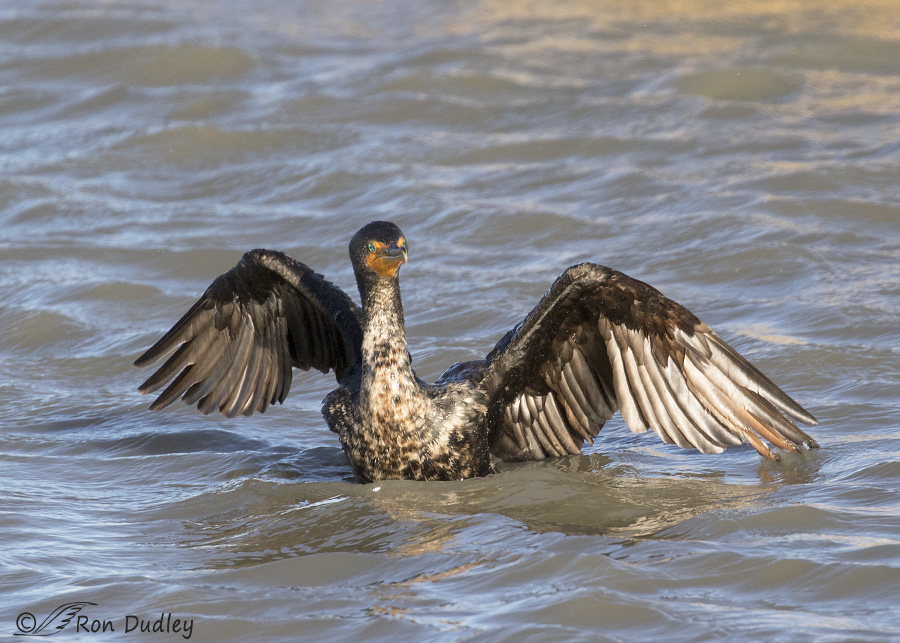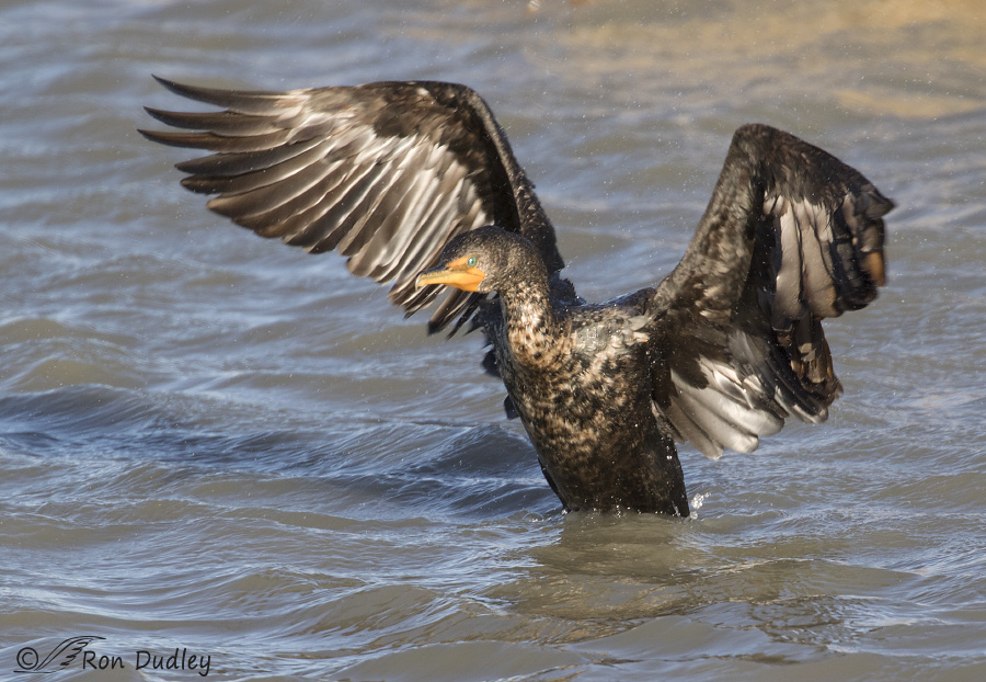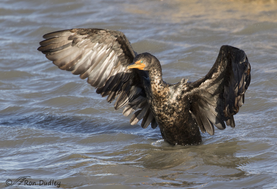 Right after emerging from a dive the cormorant unexpectedly executed an extended wing flap. I got 31 images of the performance and I’ve presented a dozen of them here, in the order they were taken. I’ll say nothing about the images individually and wait until the end of the post to provide my take on the performance of the lens + teleconverter.