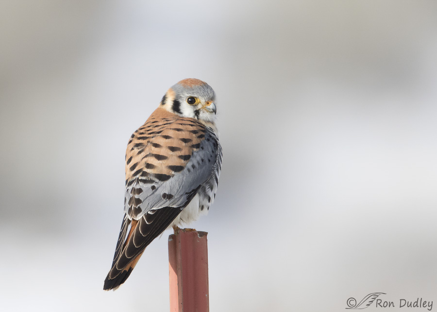 This isn’t my favorite kind of perch but it’s always special to get close to an American Kestrel and this good looking guy allowed me a fairly close approach two days ago in Box Elder County. I like the light on the falcon and the tone variations in the out-of-focus snowy background.