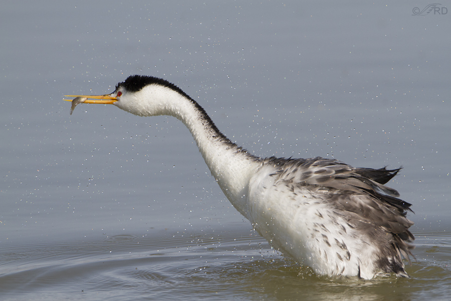 This female of a mated pair was fishing for her family as the male back-brooded two chicks (the sexes take turns with each chore). I happened to catch her just as she emerged from the water with a fish and shook the water off. I wish I had better eye contact and a little more room around the grebe but this image is full frame.