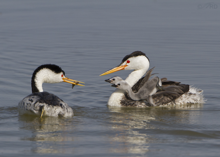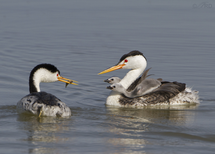 Many folks don’t notice the sexual dimorphism of grebes (Western or Clark’s) but it’s really pretty easy to tell the sexes apart if you’re relatively close to the birds. Males are larger and their bill is longer and much thicker than that of the female so in this photo the male is the bird on the right.