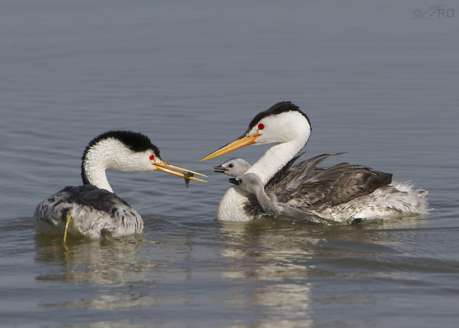 Before these young birds saw breakfast coming their way they were tucked down peacefully under each wing of their parent with only their heads and necks sticking out. But when they spotted the fish all that changed in an instant.