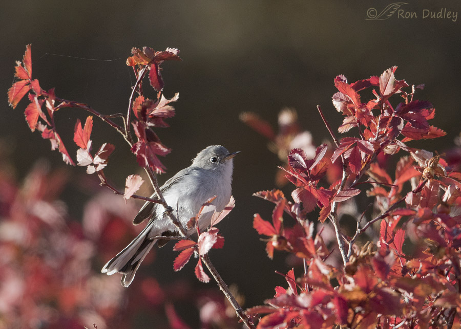 This one landed for a moment in a far-off wild rose bush and the morning light brought out those reds gloriously so even though the bird is small in the frame I’m fine with it because for my tastes the leaves and their colors are almost as important as the bird. And I like the way the heavily shaded background sets it all off.