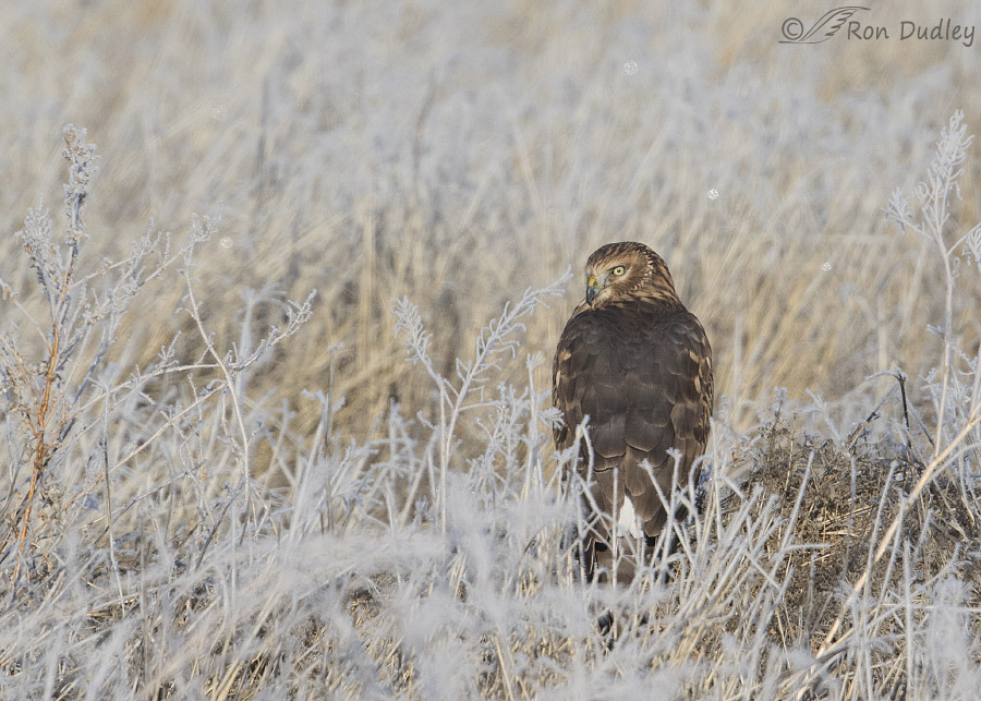 Five days ago at Farmington Bay WMA Northern Harriers were unusually scarce so even though this one was perched far away in the frosty vegetation I watched it through my lens anyway. Even if it took off I had little chance of getting decent flight shots because the hawk was facing away from me but with harriers you just never know so I sat on the bird and waited.