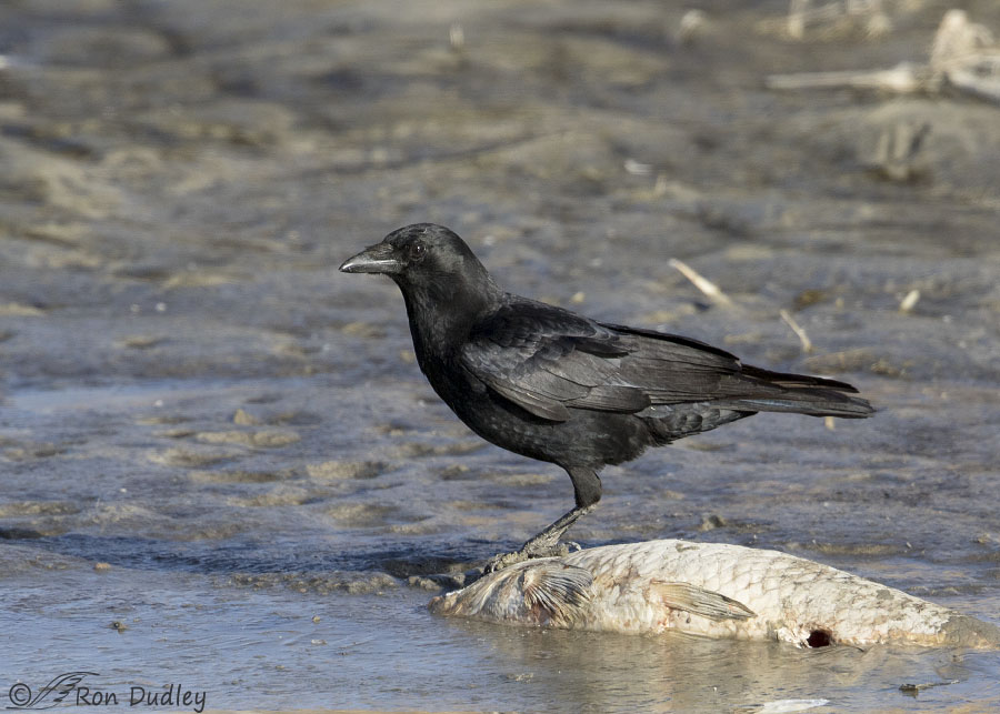 But in February at Farmington food opportunities change when refuge personnel drain many of the canals and ponds in an effort to kill the adult carp that cause so much damage to the wetlands. Large dead carp litter the ponds and stream beds and a variety of birds take advantage of the situation. Yesterday I photographed this American Crow while it was feeding on a large sun-bleached carp. Gulls gorge themselves and some birds that we don’t normally think as fish-eaters also take advantage of the situation, especially when winters are unusually cold – among them Northern Harriers, American Coots and even some passerines like Song Sparrows.