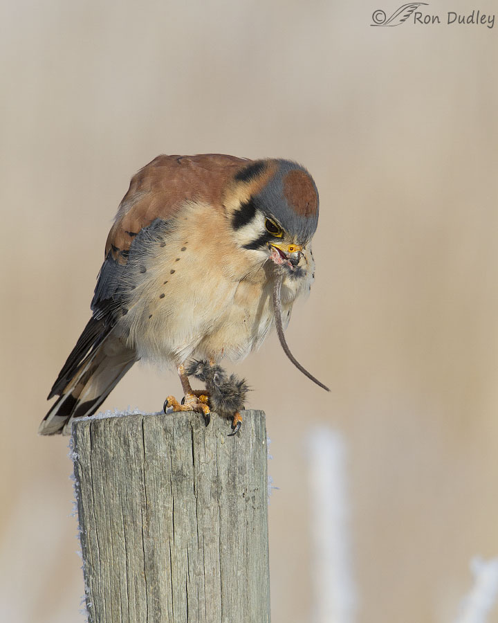 In my experience kestrels often discard rodent tails but when it’s very cold and food is at a premium it’s another matter. In this older photo from my archives this male at Farmington was working hard to get one of those tails down the hatch but it wasn’t easy. He got it mostly down before he had to bring it back up again and start over. As you can see from the frost on the post and the vegetation in the background it was very cold that morning and he was determined to get every last warming calorie he could. I have many photos of the process but he kept his head down the entire time and this is one of the few shots that includes any light in the eye.