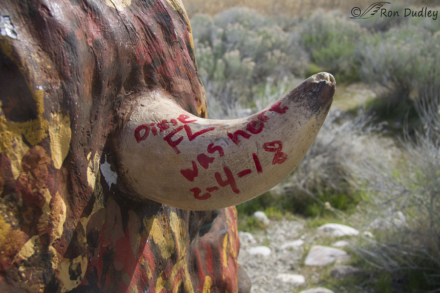 Tourists from Florida tagged one of the horns of this one a couple of months ago. To my knowledge this vandalism was first reported on Facebook by Judy Miller Watson. My ranger friend said there were plans to get it repaired and “law enforcement is investigating”.