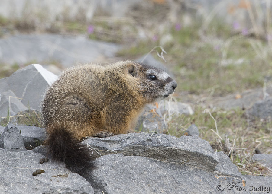 In the previous images, before he’d stretched, I had enough room in the frame to rotate the images during processing and get the fence level. But now I didn’t so I couldn’t level the image during processing without cutting off part of the marmot (leveling an image requires us to crop out parts of the photo). The result was tilted photos that were still too tight in the frame.