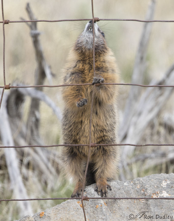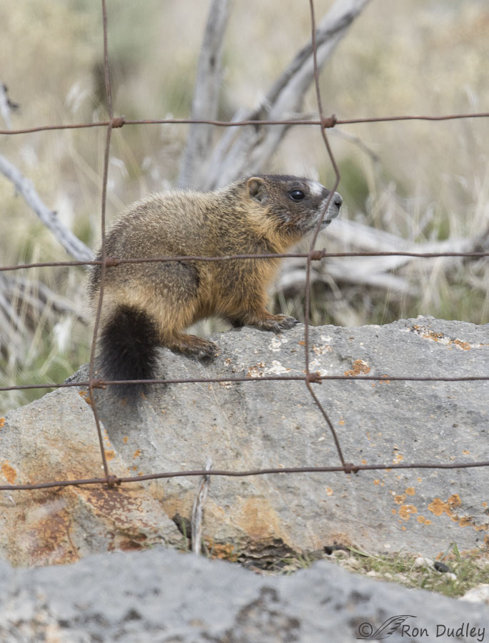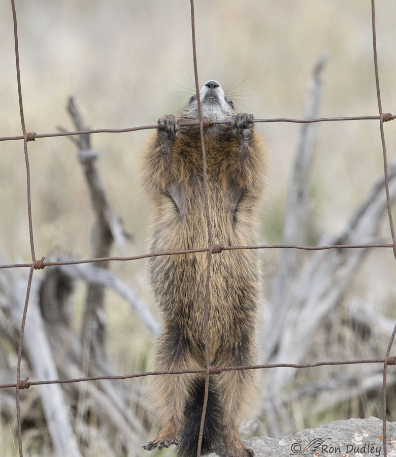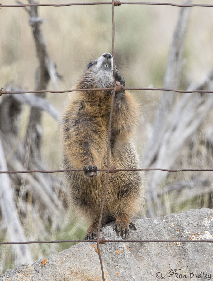 Three mistakes, miscalculations, screw-ups – whatever you wanna call’em – caused me to partially mangle this unique opportunity with a Yellow-bellied Marmot cub climbing a fence.