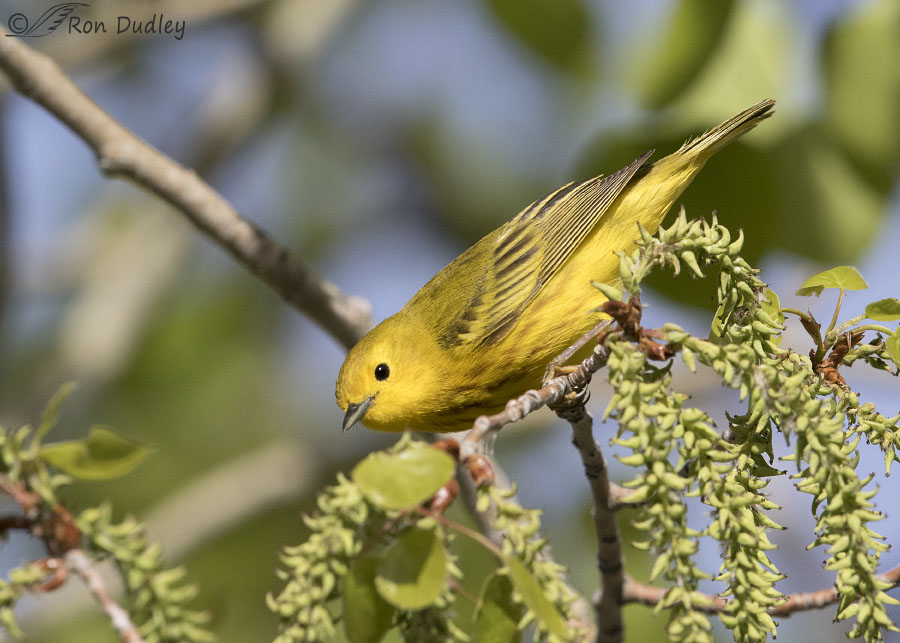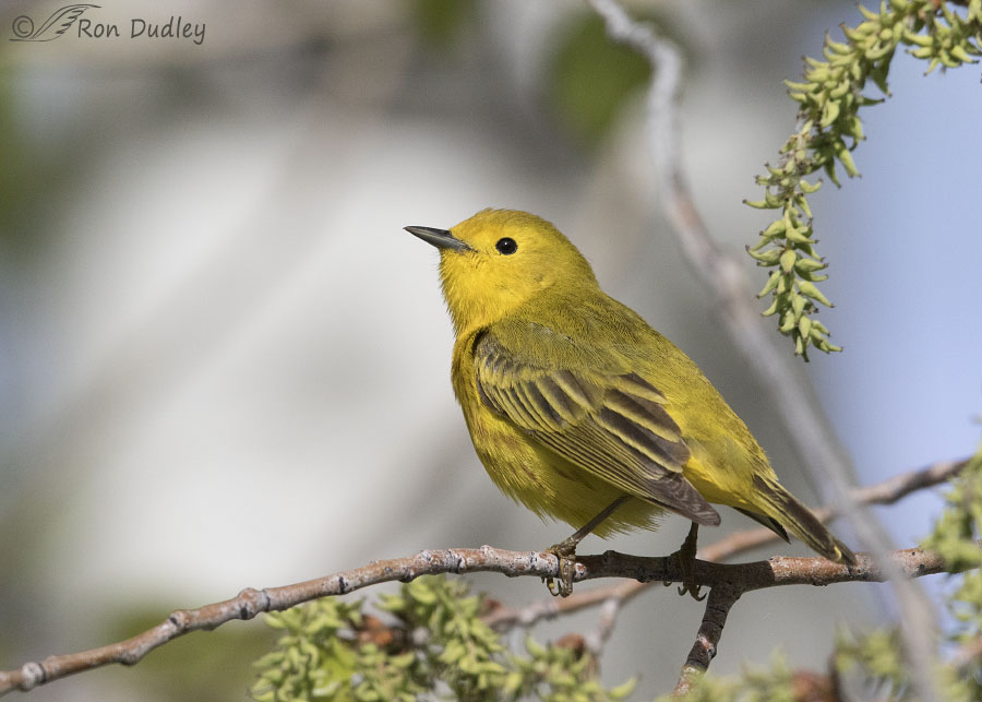 And here’s the warbler on the lower perch with another strand of catkins at upper right. The almost white part of the background might not be ideal but it’s a relatively clean shot of a Yellow Warbler in a tree and for me that’s an absolute rarity.