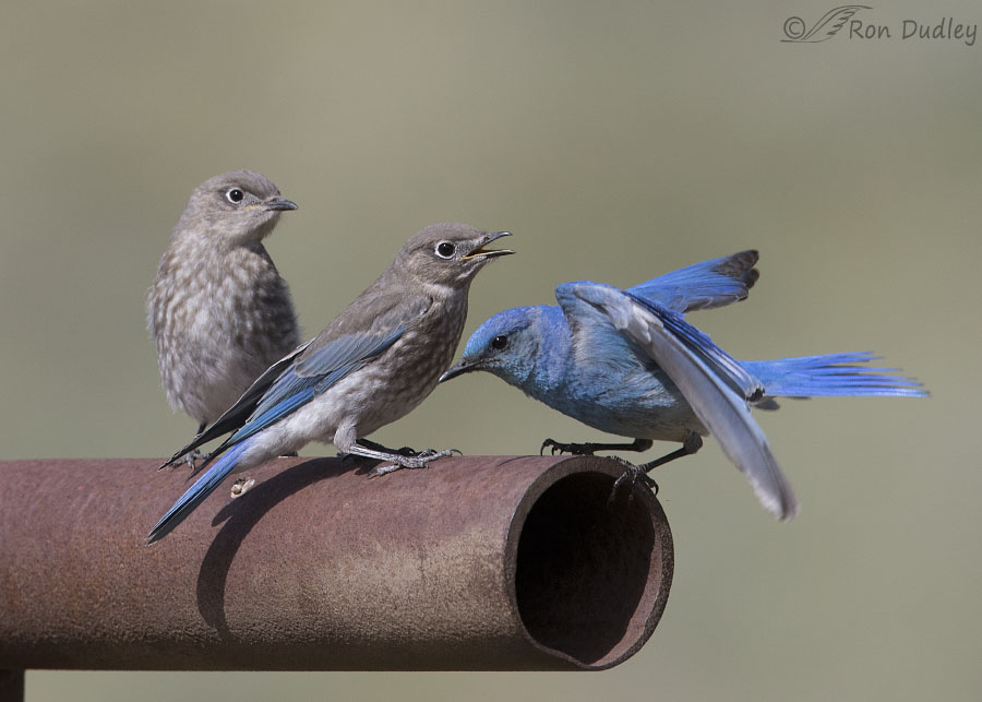 There were several old and rusty fence-like structures made of heavy pipe in the area and they were favorite perches of both youngsters and adults. These two fledglings were already there when the male landed next to them. He didn’t have any food…