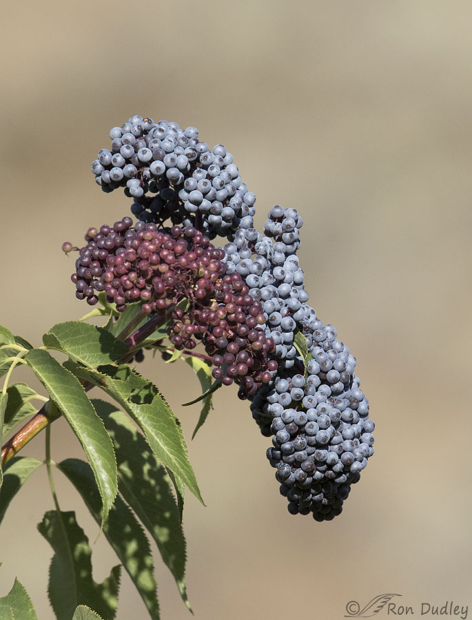 When these darkest berries turn a deep purple-black and become even a little more plump they’ll be heavy enough that many of the clusters will hang almost upside down and that’s when they’ll be fully ripe for birds and for humans, although I hope birds get every last one of them.