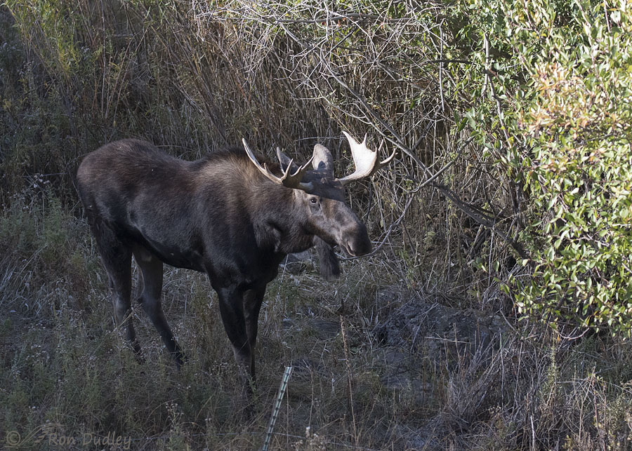 8:48 AM: Two days ago we found a bull moose sleeping or resting (I suspect the former) in the deep, deep shade of a nearby mountain. The light was so poor it was hardly worth taking any photos but you know me and documentary images. I only had 1/100 sec shutter speed for this photo taken at an effective 1120mm so I was lucky to get it as sharp as I did.