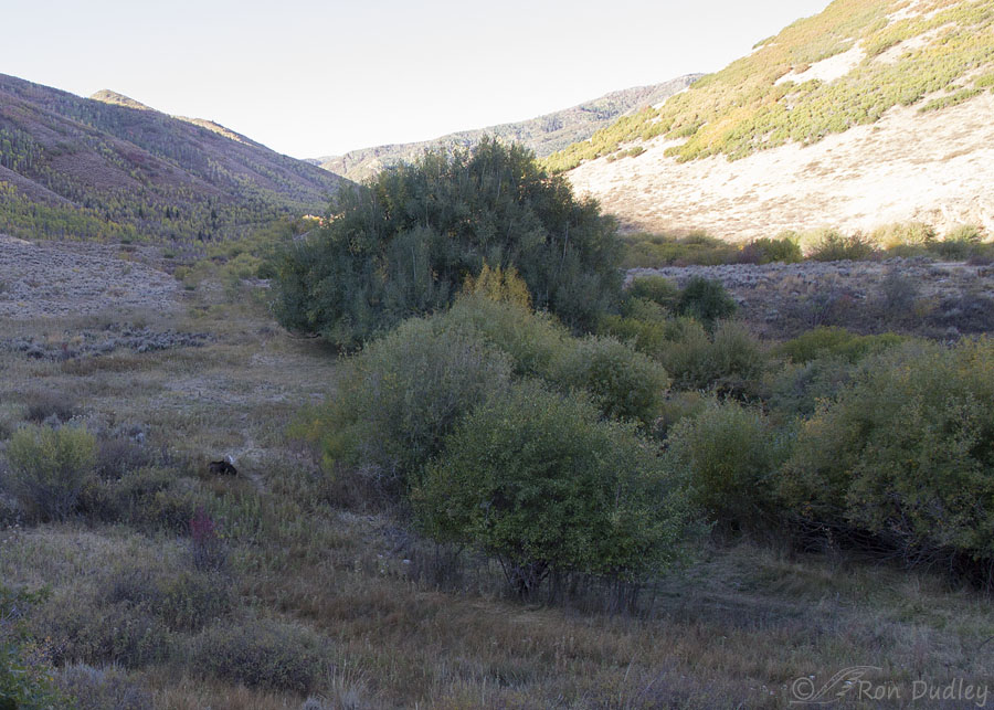 9:15 AM: Twenty seven minutes later the light from the sun coming over the mountain was still so far away from the moose (dark spot at lower center left) that it seemed futile to wait around any longer. The moose was likely to wander into the willows before the sun reached him so at one point I drove down the well-lit road to see if I could find any birds.