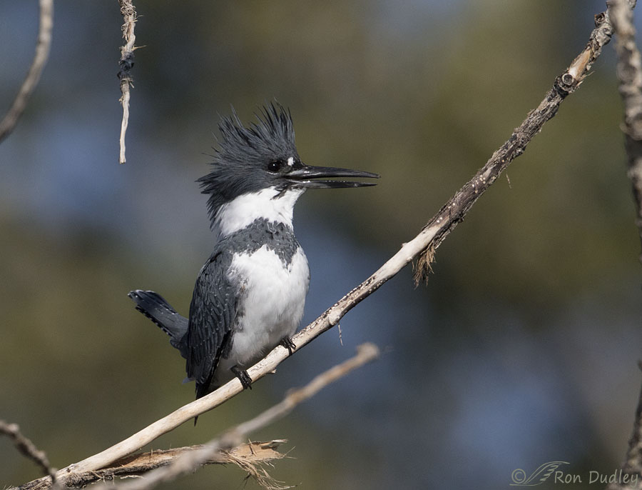 Most of the time this male was far too distant for any decent photos or he landed in a tree where he was almost completely obstructed by branches (that’s the kingfisher way, ya know…). But this time he landed where I had a clear view of him and I actually like the background. He only faced me for a few seconds and this is the only shot I got with his tail up instead of down behind the perch and other branches.