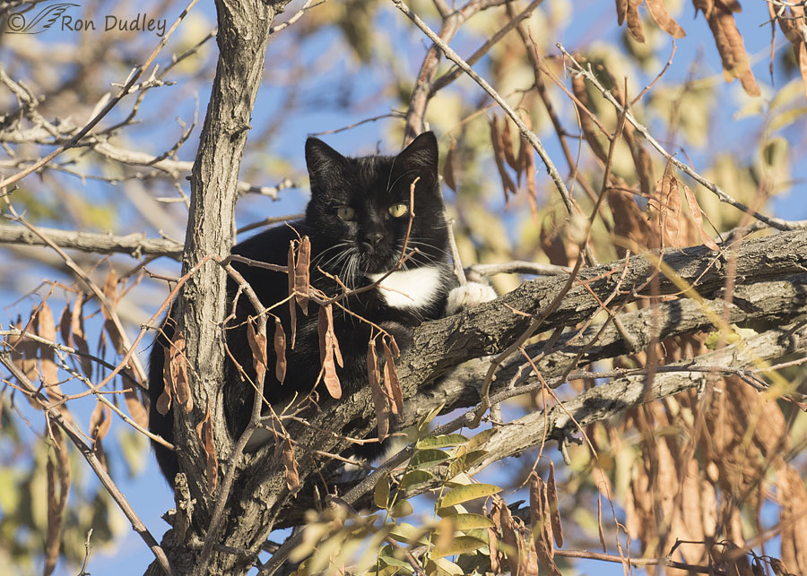 The goal of the cat was feline mayhem directed at this male American Kestrel at upper right. In this case its chances of success were probably nil but the photo visually demonstrates the determination of the cat high in the tree and the huge problem for native wildlife in North America caused by feral cats.