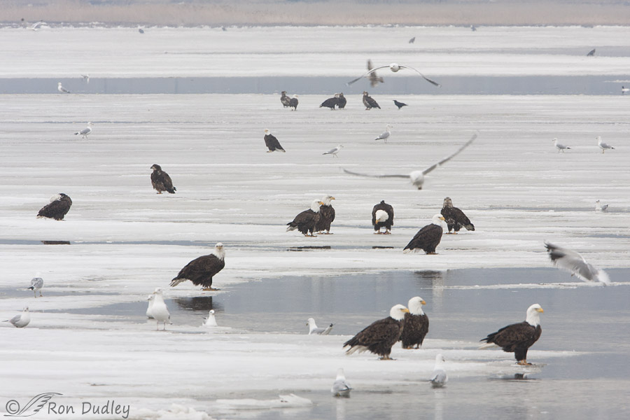 Back in those days this was a fairly typical view from the road heading to the 4-way looking out over the ice on Unit 1 – more eagles than you could shake a monster lens at. I count a minimum of 23 eagles in this narrow view taken at an effective 1120 mm with my 500 mm lens and attached teleconverter. That’s a very narrow slice of Unit I and there were many more eagles out of frame to both the left and right.