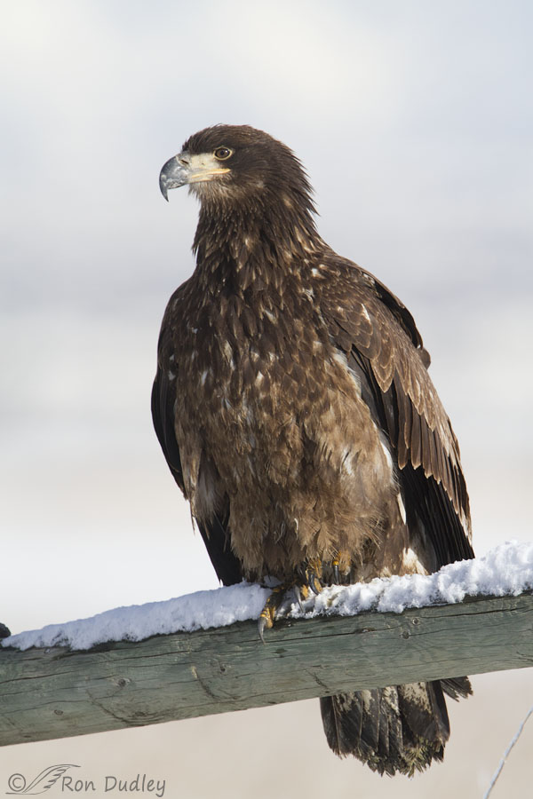 Occasionally there were opportunities elsewhere, including this amazingly “tame” juvenile. Most eagles on the refuge are skittish, especially early in the season, but this one almost seemed to crave human company. This bird landed right in front of me at a distance of less than two car lengths and I was on foot rather than in my pickup. The photo is full frame (uncropped) and I had to back further away to get all if ‘him’ in frame. Some folks were even closer than I was.