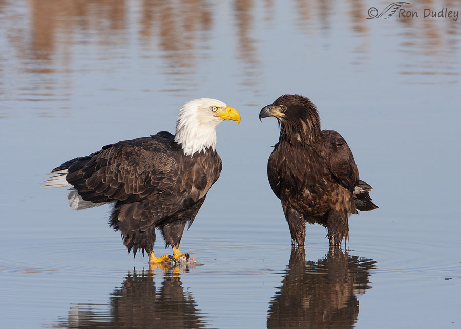 Here we have a full adult and a juvenile facing each other down. The source of their tension is what’s left of a fish in the adult’s talons – the adult had it and the juvenile wanted it.