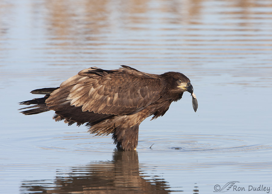 This juvenile had been feeding on a carp just below the water’s surface (one of its fin spines can be seen sticking up out of the water) when it suddenly plucked off a pectoral fin and held it in its bill for a few moments before presumably gulping it down. By this time most of the flesh had been stripped off of the fish so scraps like fins were about all that was left.