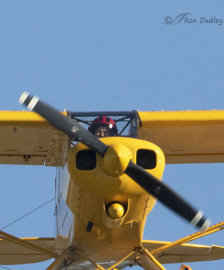 A huge crop of the same photo (5% of the original image) makes it obvious that the pilot saw my pickup but he made no effort to turn away as he passed much too close overhead. In a state park! The reason he didn’t turn away may (or may not) have been to prevent me from reading his N-numbers, especially when he saw my big lens pointed his way. Unless he was blind he couldn’t have missed my lens and I doubt there are many blind pilots out there.