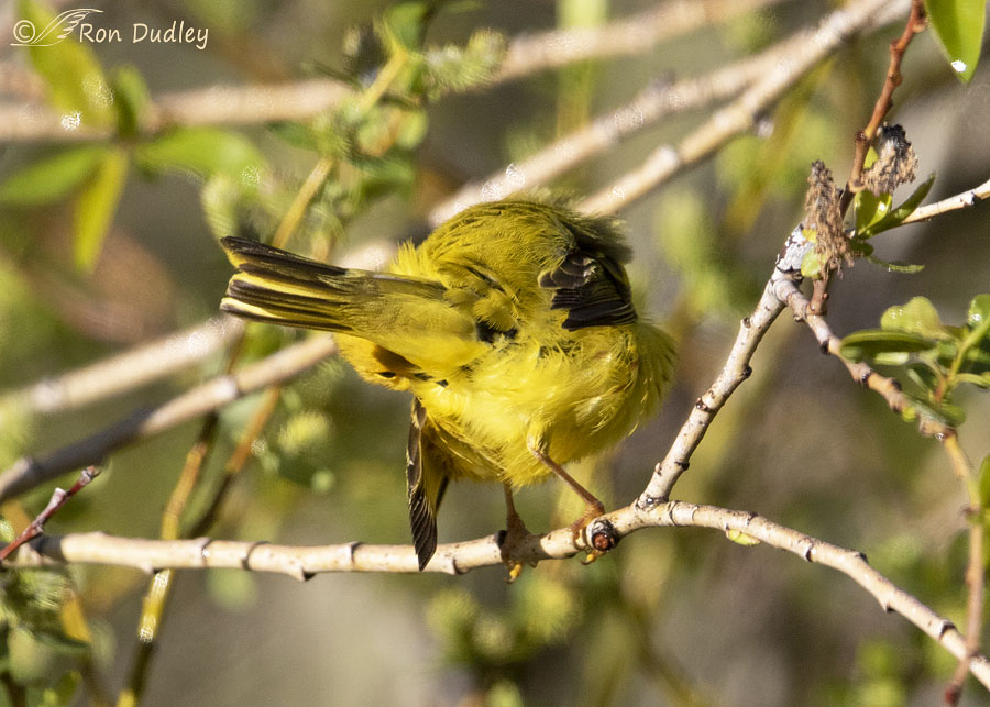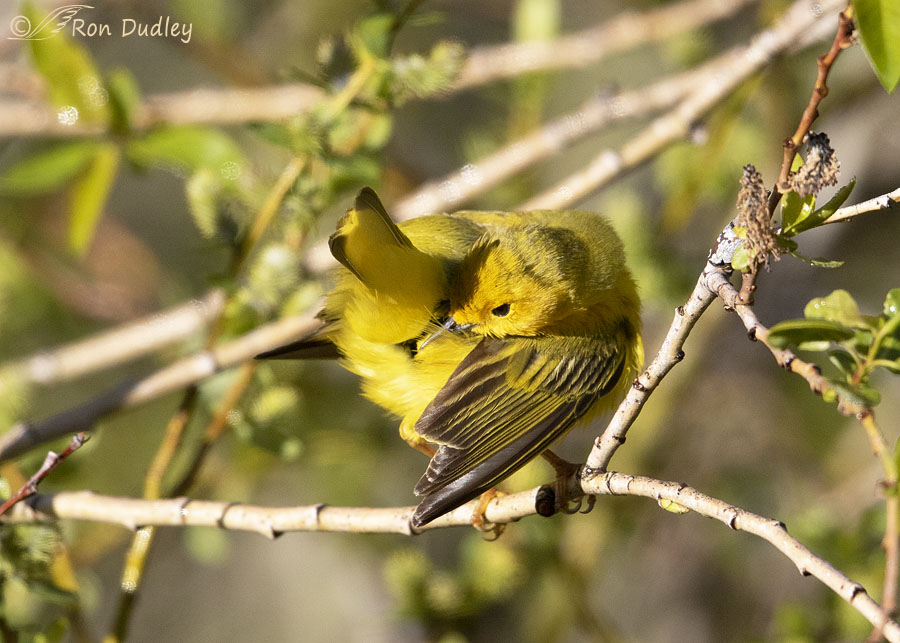 Recently I posted this photo of a Yellow Warbler doing his best Quasimodo imitation in an effort to better expose his plumage to sunlight. The light and resulting heat from this behavior (referred to as sunning) encourages parasites, feather lice in particular, to move to more accessible areas so the bird can more adequately deal with them during preening.