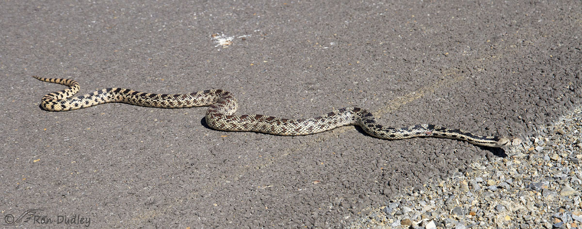 A beautiful and quite large Great Basin Gopher Snake sunning itself on the road. I estimated its length to be over 5′ and since 5.75′ is about as large as they get I consider it to be a big snake. It had shiny scales and clear eyes so I believe it had fairly recently shed its skin.