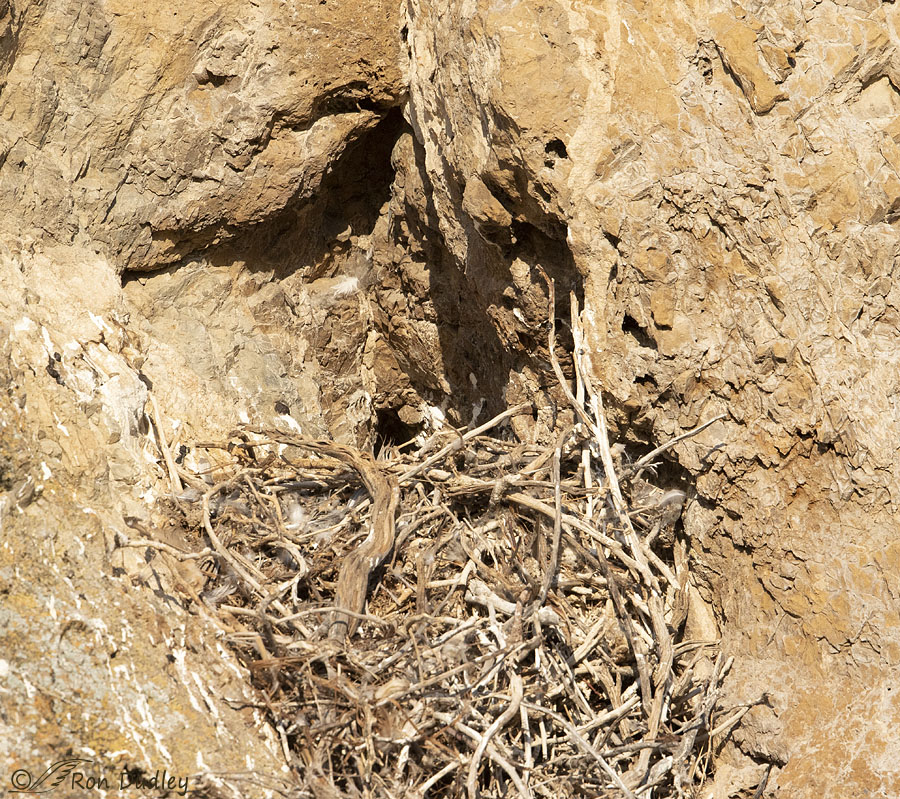 The nest is actually an old raven’s nest built at the entrance to a small alcove or shallow cave in the cliff. The alcove is deep enough that both fledglings could disappear in its depths. And as you’ll see in the photos below the nest looks very different at different angles and in different light.