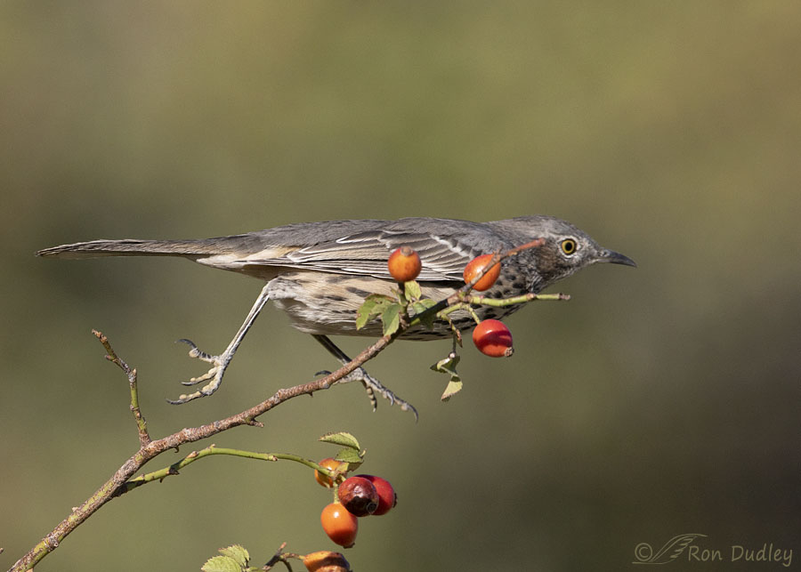 Slightly less than a year ago while I was shooting a variety of other birds in a remote area of Box Elder County this Sage Thrasher landed on an ideal spot on a wild rose and posed for some time. I like virtually everything about this shot including but not limited to the jaunty foot-forward pose, the placement of the colorful rose hips, the background, the composition and the even lighting on both bird and perch. The thrasher is sharp and there’s oodles of detail, in part because this image has been cropped very little (it’s 88% of the original image, 17.6MP out of 20MP).