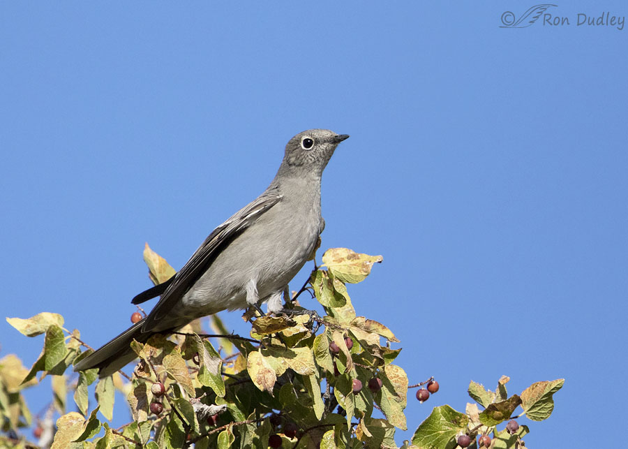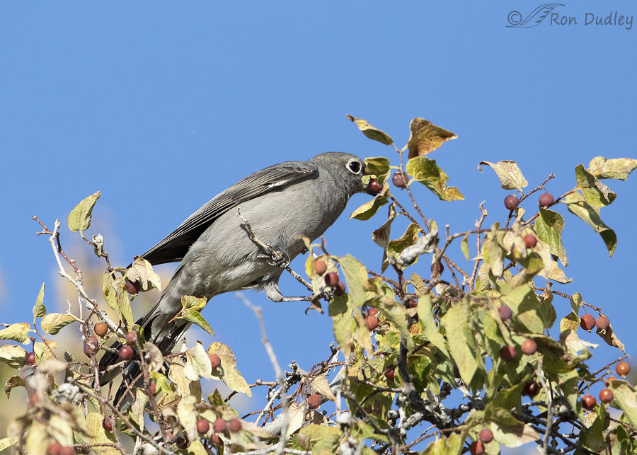 Three days ago while I was photographing kinglets and sparrows in extreme northern Utah this Townsend’s Solitaire unexpectedly showed up looking for a meal. First “he” surveyed the area for potential threats but I must have looked harmless enough because he fairly quickly ignored me and went after some of the nearby berries.
