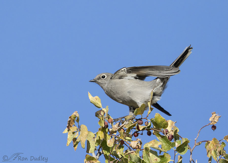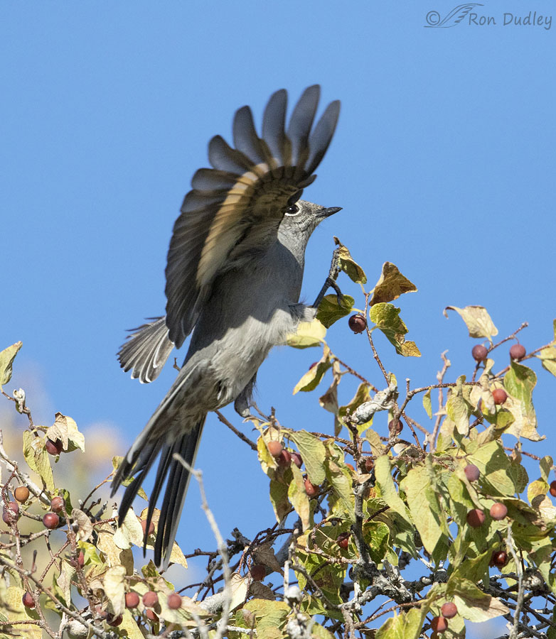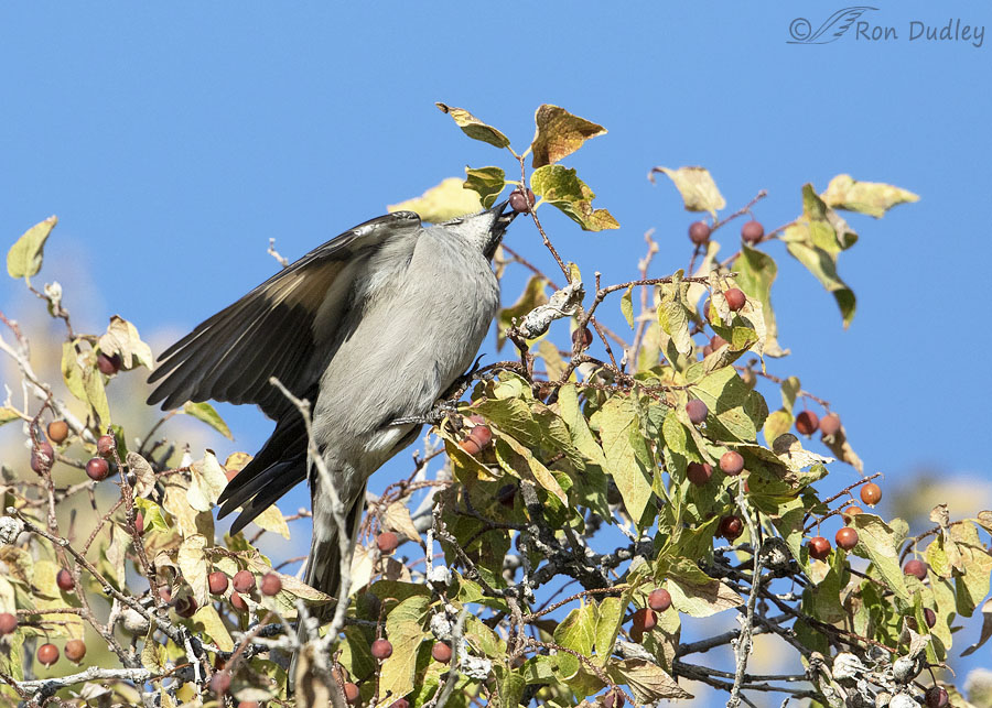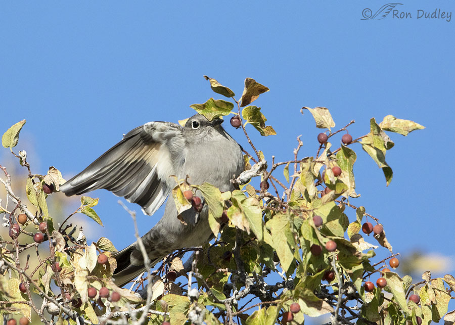 “Document these kinds of seemingly meaningless behaviors.” And document you did, and of course not meaningless to them. Really nice series Ron. I have found that some of the best bird photos can be had while they are in pursuit of berries and other edibles. When they are involved like this they will often not leave just because you are near. I have only seen and been able to get photos once here near our Granite Mountain. Although almost all grey except for the spread wings I think they are very handsome birds. Like the white circle around the very black eyes.
