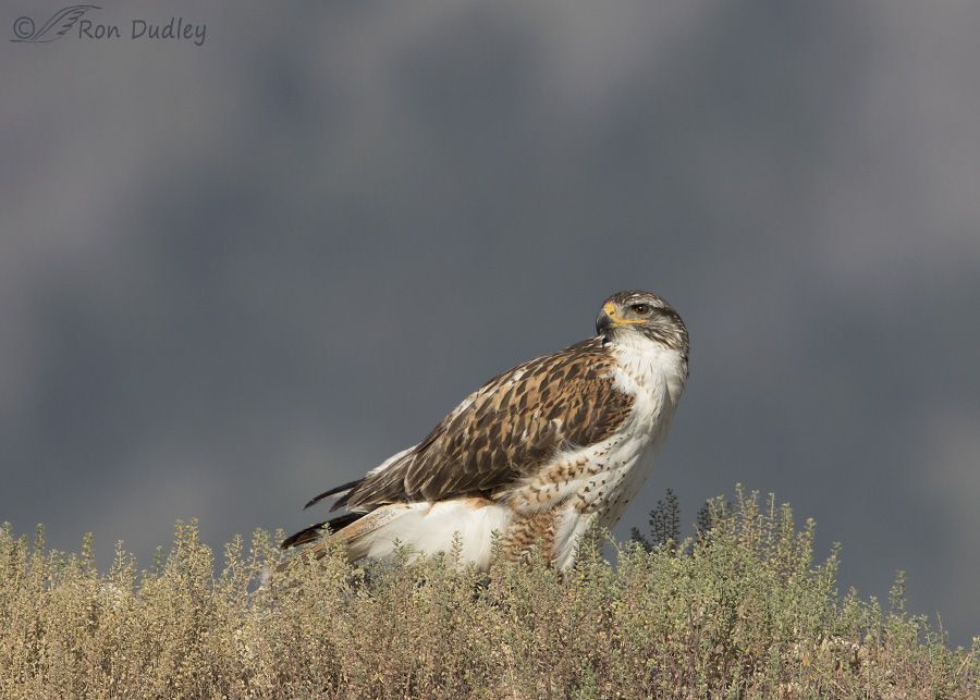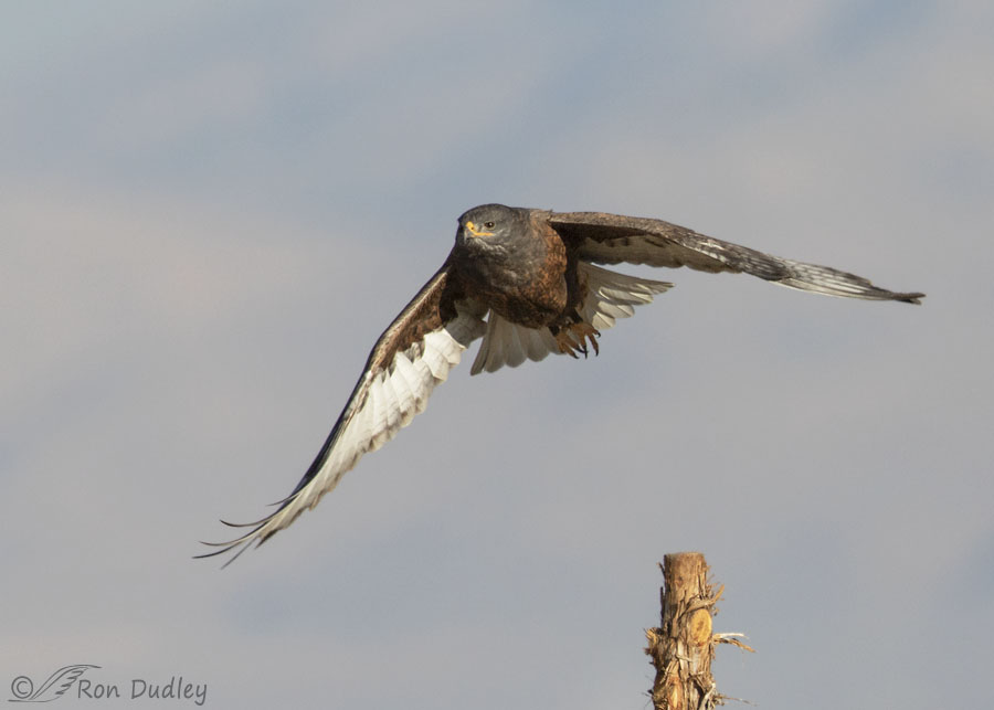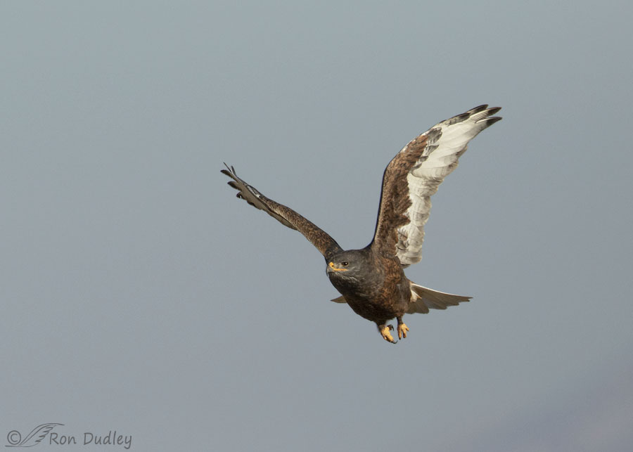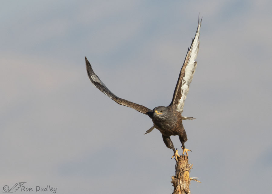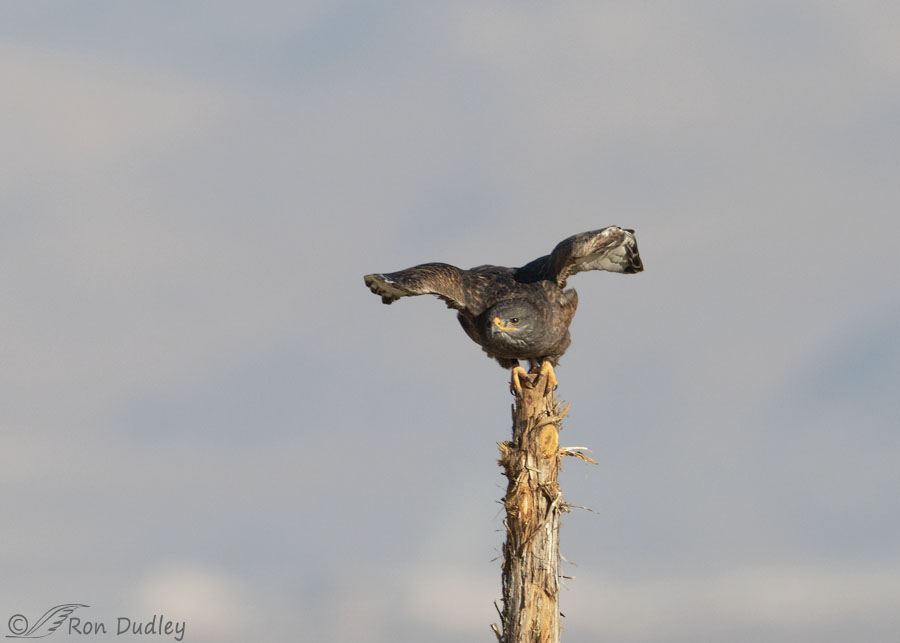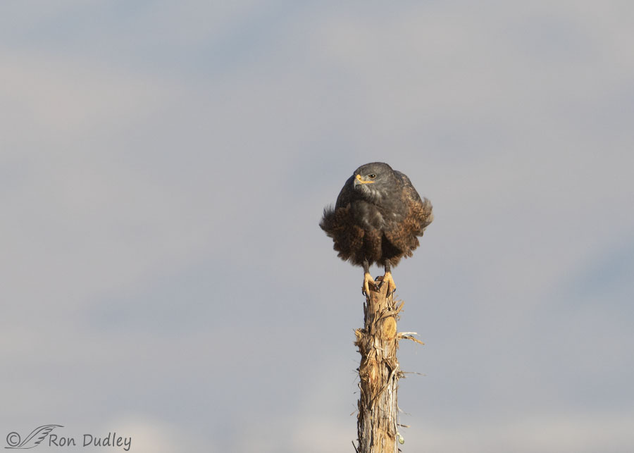 The dark color morph of the Ferruginous Hawk is unusual, significantly less than 10% of the population in North America. Since Ferruginous Hawks of any color are uncommon (Sibley calls them “rare”), the dark morph is a very narrow slice of that uncommon group and Ferruginous Hawks in general are such regal and impressive hawks I’ve been enamored of this bird ever since I found “him” a couple of weeks ago.