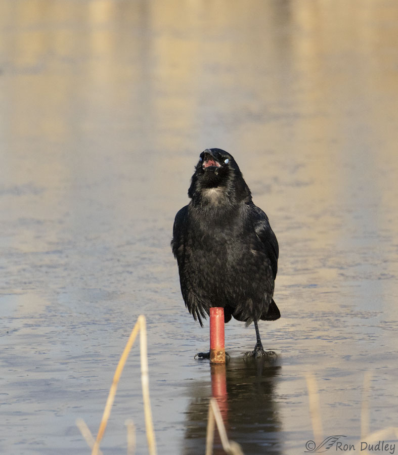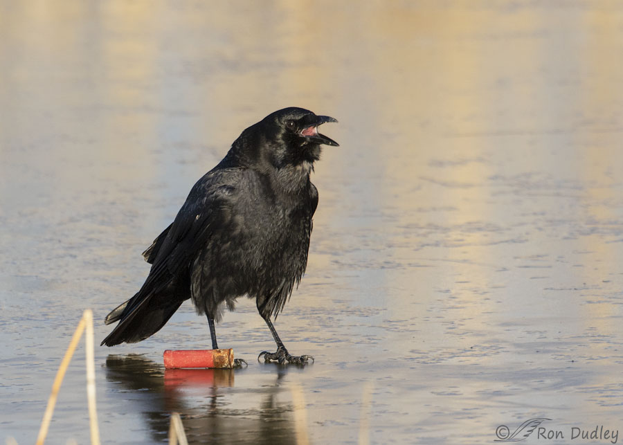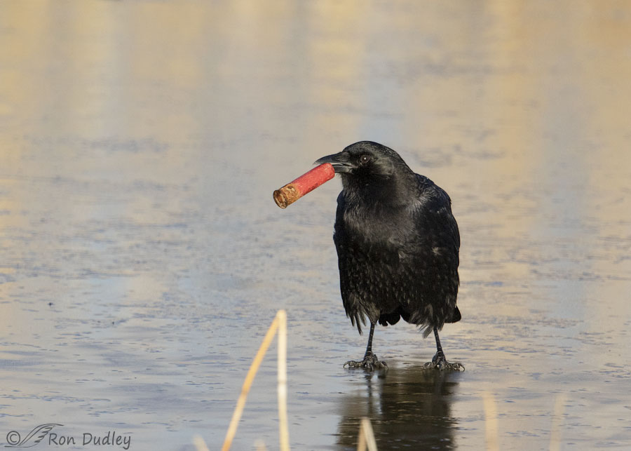As I approached the crow on the ice and saw something red below “him” I assumed he was feeding on something bloody but when I got my lens on him it became instantly obvious that it was a spent shotgun shell (waterfowl hunting season closed a few weeks ago).