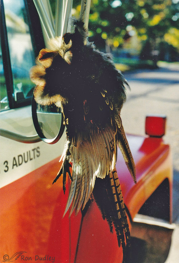 Twenty some years ago my parents moved from Colorado to Utah to live with me for what turned out to be the last five years of their lives. I drove the largest truck available from U-Haul filled with everything they owned from Olathe, CO to Salt Lake City. Near Provo UT on I-15 while I was driving about 70mph this male pheasant flew up, glanced off of the right side of the windshield and ended up being embedded in the passenger side mirror of the truck. The windshield didn’t break but that big mirror was completely destroyed.