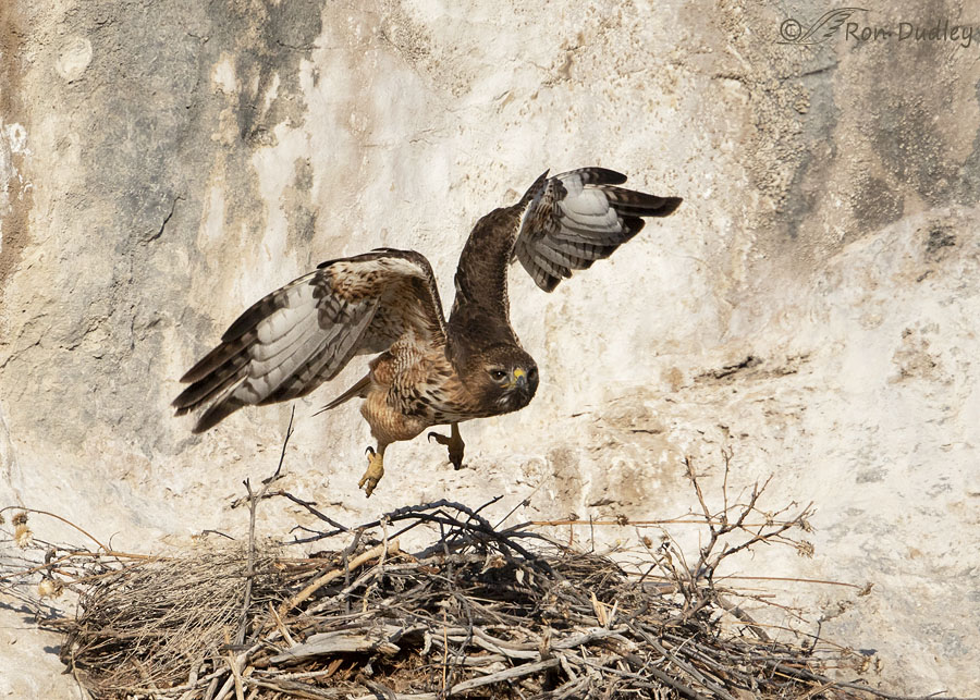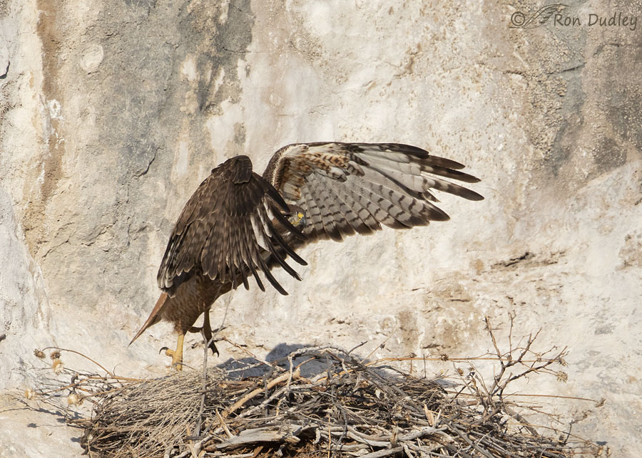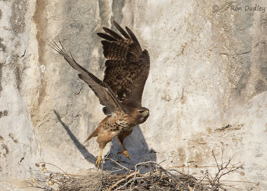 Three days ago I was able to spend a short time with a mated pair of Red-tailed Hawks as they were working at refurbishing an older nest on the side of a cliff. They always had their backs to me as they approached the nest in flight with nesting material but I managed to get this series of the male as he was leaving the nest after making one of his deliveries.