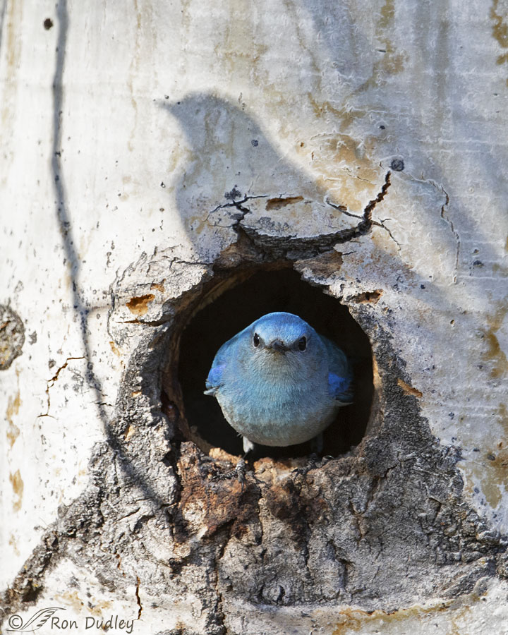 This is the male Mountain Bluebird about to exit the nest cavity. In a previous post I complained about some twigs almost directly in front of the cavity that cast unfortunate shadows on the entrance for much of the morning and ruined many of my photos. Both bluebirds liked to perch on those twigs in order to guard their nest from a marauding House Wren that kept trying to take over the cavity for its own nesting purposes.