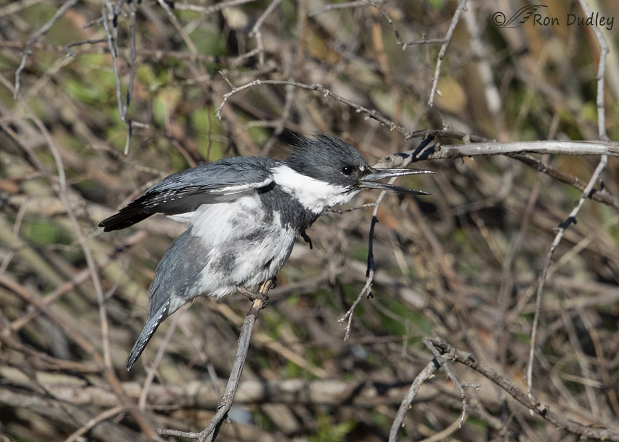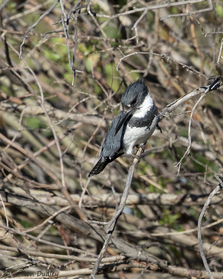 As for head-scratching over the wing, that’s what all Belted Kingfishers will do. All birds of a particular species are either “over-the-wing” or “under-the-wing” head/neck scratchers. The pattern is consistent throughout the species. In general, predominately ground-dwelling birds head-scratch under-the-wing and those perched in trees are over-the-wing, but there are many exceptions. If you are on the ground it is usually easier to raise the wing and on a perch, better balance is maintained by going over-wing.
