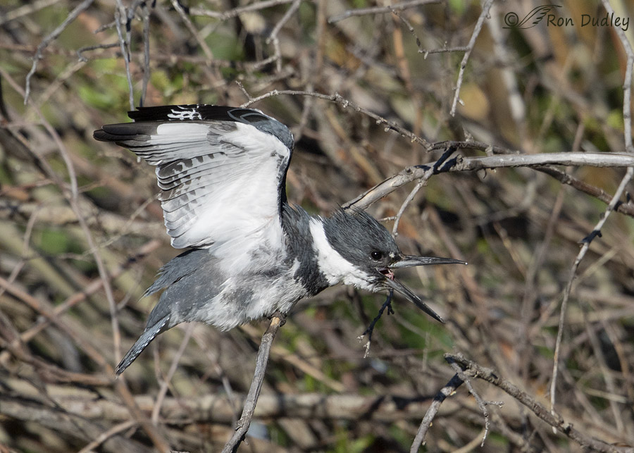 Long lens really helps with these guys and gals. I use a super-zoom bridge camera that requires getting much closer, and as you know these Kingfishers will be gone if they sense you are somewhere close. These are excellent photos Ron. Love the outstretched wings. Have also not seen any snakes of any kind so far and we are no doubt warmer than you are so far this spring.